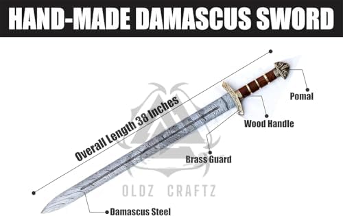 The OLDZ CRAFTZ 38” Viking Sword is a masterfully handcrafted collectible inspired by authentic Norseman swords. Forged from high-quality Damascus steel, this full-tang blade offers superior strength and durability. Featuring a wooden handle with leather grip and custom scabbard, it’s perfect for collectors, reenactors, and historical enthusiasts.
