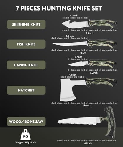 The Jellas 7-Piece Hunting Knife Set is a professional-grade field dressing and game processing kit designed for hunters, campers, and outdoor enthusiasts. It combines precision knives, a heavy-duty axe, a bone saw, rib spreader, and a sharpener in a rugged carry case for portability and organization in the field.