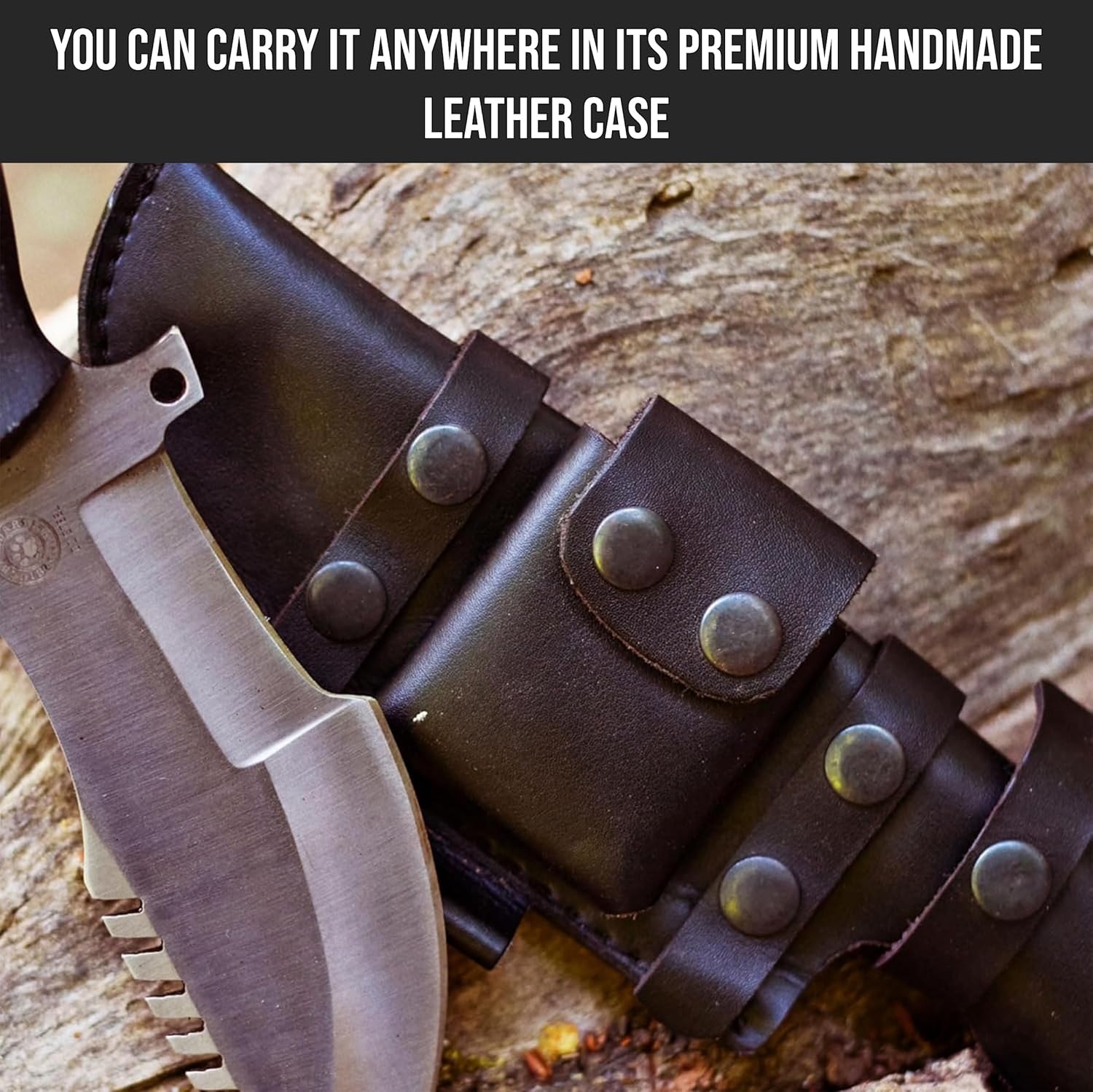🧵 Hand-Crafted Leather Sheath – Vertical-carry cowhide sheath with belt loop and snap fastener for safe, rapid deployment.