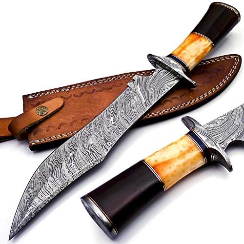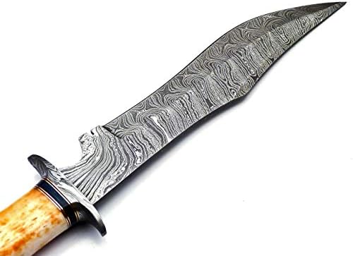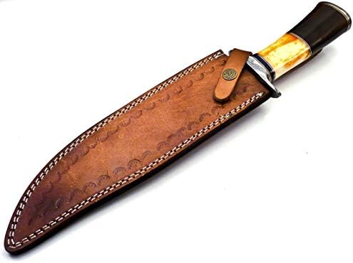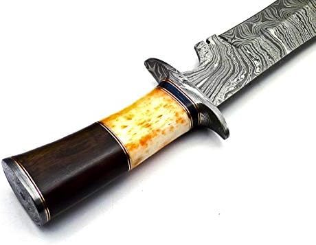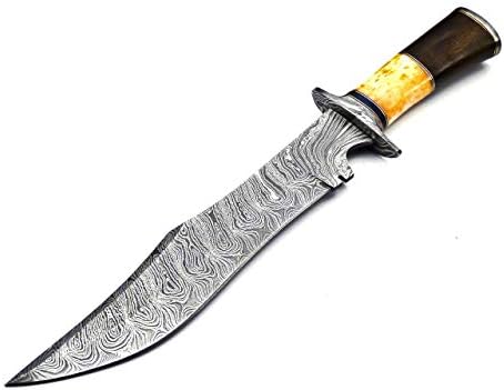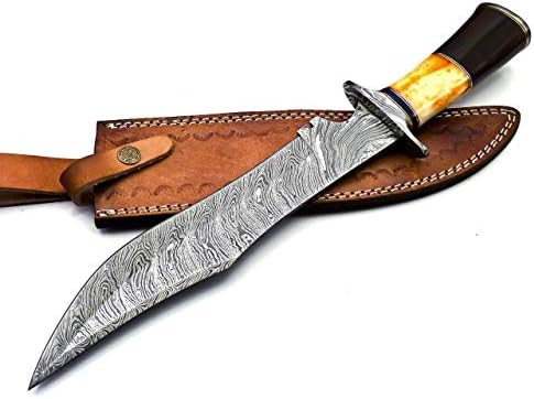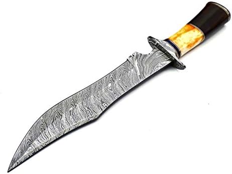 The BK-40 Handmade Damascus Steel 15” Bowie Knife is a premium Damascus bowie knife designed for hunters, survivalists, and outdoor enthusiasts. Featuring a 10-inch blade forged from 15N25 & 1075 true-layer Damascus steel and a full tang construction, this knife delivers unmatched sharpness, durability, and precision. The ergonomic rosewood and bull horn handle ensures excellent balance and control for skinning, chopping, cutting, camping, or tactical use.
