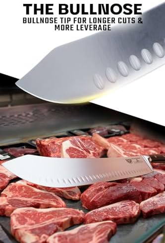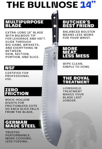 The Dalstrong Gladiator Series 14-Inch Butcher Knife is a professional-grade butcher knife designed for chefs, home cooks, and BBQ enthusiasts. With a long, bulbous blade for clean, precise cuts, it excels at portioning meat, trimming briskets, and breaking down large game efficiently.