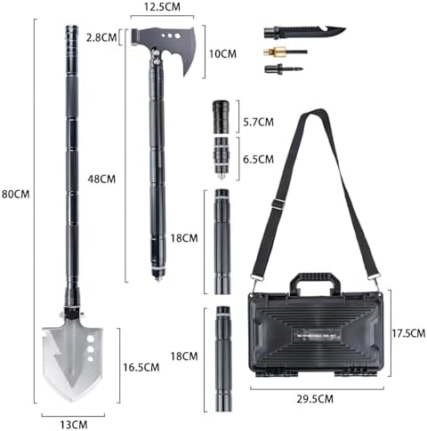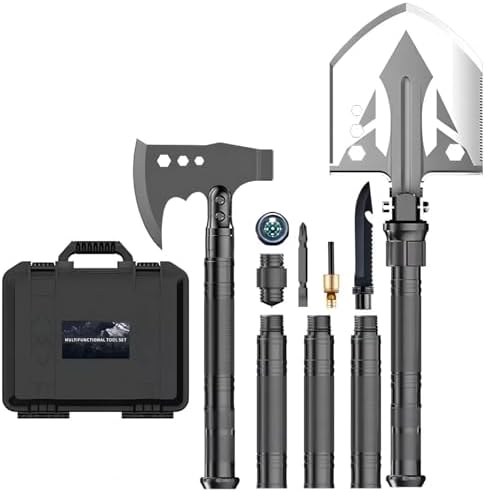All-in-One Package: This set includes a shovel, axe, three extension rods, whistle, attack cone, compass, wrenches, sawtooth, fish knife, safety hammer, magnesium rod, and screw kit.