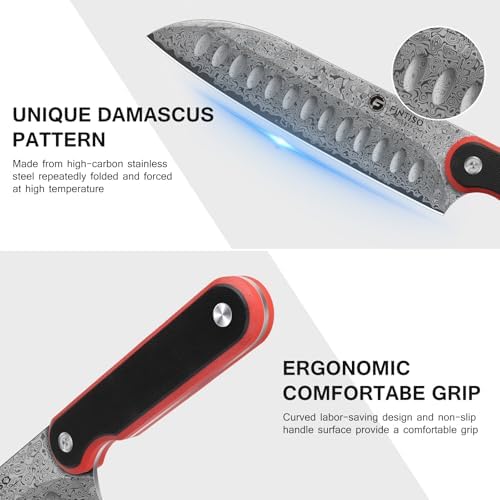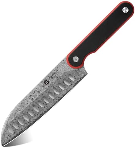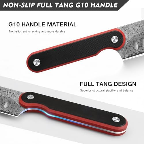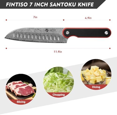 The FINTISO 7-inch Chef Knife is crafted from 67-layer Damascus steel with a 10Cr15CoMoV core, offering superior hardness, edge retention, and rust resistance. Its full tang G10 handle ensures comfort, balance, and durability, making it an essential kitchen tool for professional chefs and home cooking enthusiasts.