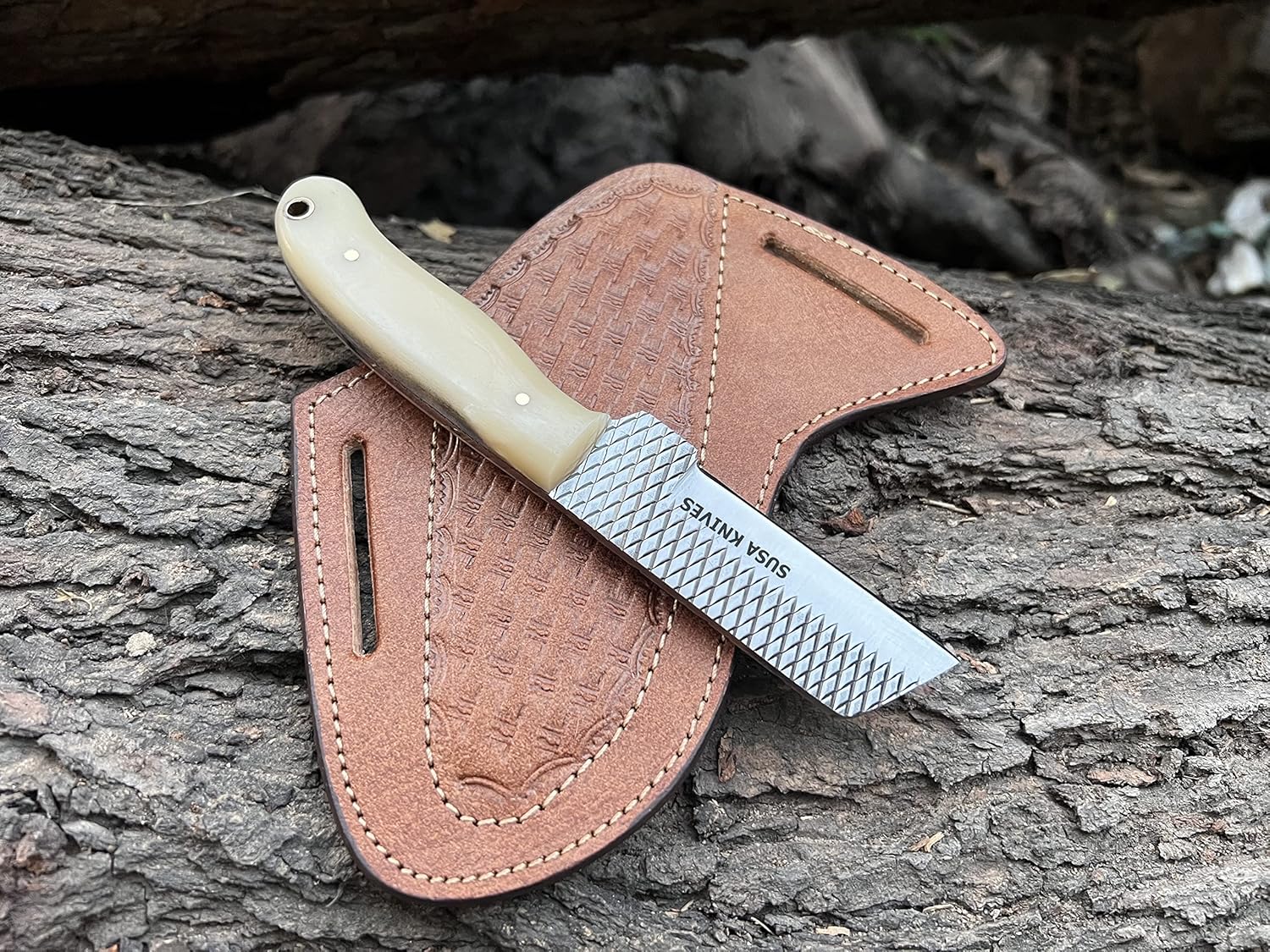 Crafted through pure hand forging and quenching, this Bull Cutter Knife delivers exceptional strength, sharpness, and reliability. With a full tang camel bone handle and a hand-stitched full-grain pancake leather sheath, it’s built for durability in hunting, fishing, camping, and daily outdoor tasks.