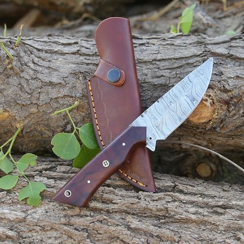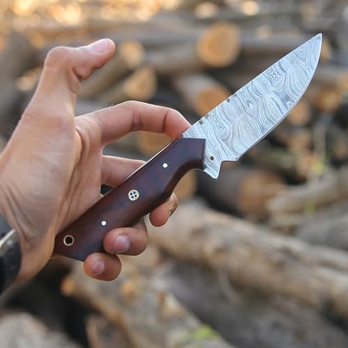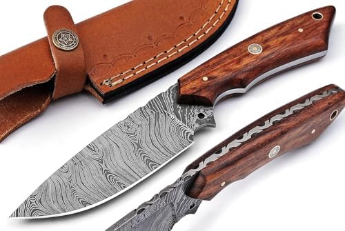 Experience craftsmanship at its finest with this Damascus hunting knife. Hand-forged from genuine Damascus steel, it features a sharp 4.5-inch blade and a full tang design for superior strength and precision. The elegant rosewood handle ensures a comfortable, ergonomic grip, while the included leather sheath provides safe storage and portability for outdoor adventures.