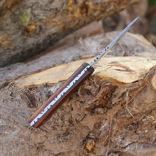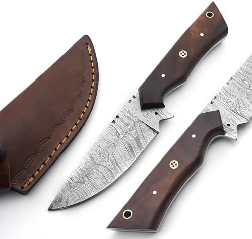The Damascus hunting knife is a reliable companion for outdoor enthusiasts. Its razor-sharp edge and full tang construction provide precision cutting, while the ergonomic rosewood handle ensures comfort during extended use. Perfect for survival, bushcraft, and recreational hunting.