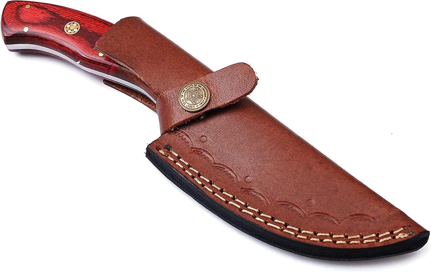 Genuine Leather Sheath: Hand-carved, stitched cowhide leather sheath with belt loop and snap fastener for safe carry.