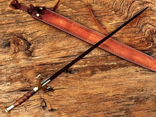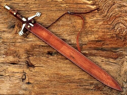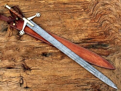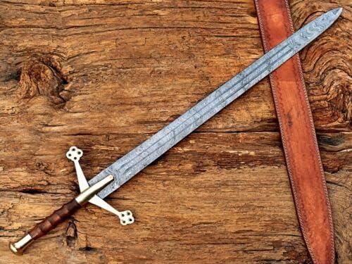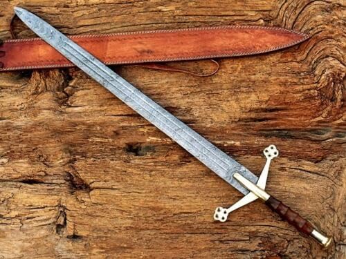 Experience the perfect blend of craftsmanship, durability, and elegance with this Damascus Steel Claymore Sword. Handmade from solid Damascus steel and featuring a stunning rosewood handle, this sword is designed for collectors, outdoor enthusiasts, and Viking or medieval-inspired displays. Its sharp edge and included leather sheath make it both functional and decorative.