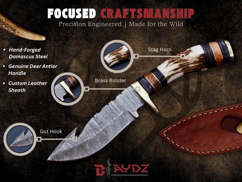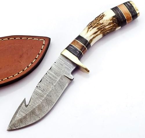 The Damascus steel hunting knife is a premium tool designed for hunters, campers, and outdoor enthusiasts. Featuring a distinctive wavy Damascus blade, this fixed-blade knife delivers exceptional sharpness, durability, and precision for skinning, dressing, and versatile outdoor tasks.