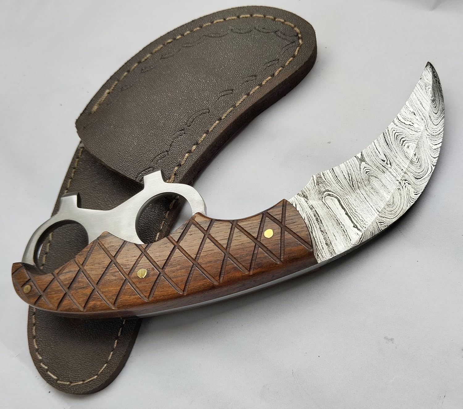 This Damascus Steel Karambit Knife is a hand-crafted, full-tang weapon designed for performance, control, and visual impact. Inspired by traditional karambit designs and modern USA-style craftsmanship, it delivers exceptional balance and strength for collectors, martial artists, and outdoor enthusiasts.