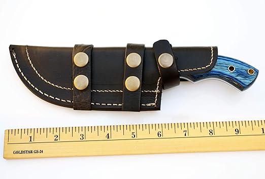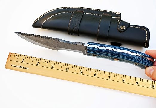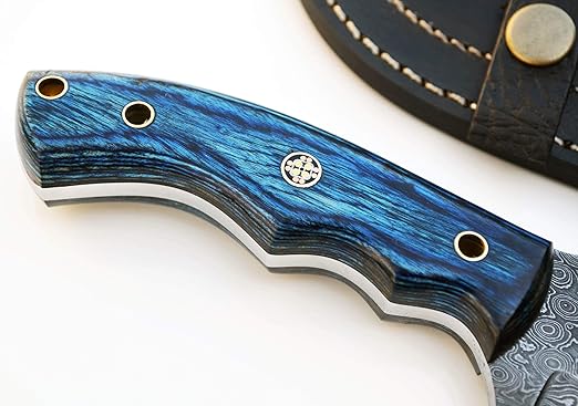 This knife delivers unmatched outdoor performance. Its durable Damascus steel blade handles skinning, cutting, and field preparation with ease. The full tang construction ensures strength and balance, while the ergonomically shaped blue pakkawood handle provides a firm, comfortable grip, reducing hand fatigue during prolonged use.