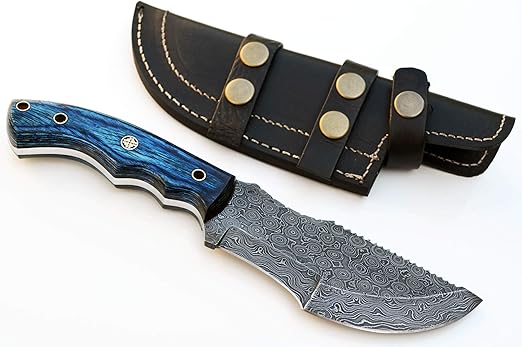 This Damascus Tracker Knife is more than just a tool — it’s a reliable hunting and outdoor companion. With its raindrop pattern, blue pakkawood handle, and versatile sheath, it combines performance, comfort, and elegance for both serious outdoor use and collector appeal.