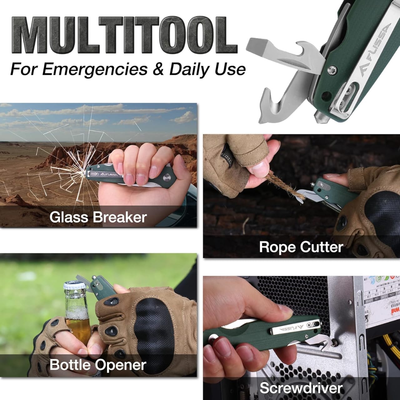 Multitool design: glass breaker, rope cutter, slotted & Phillips screwdrivers, bottle opener