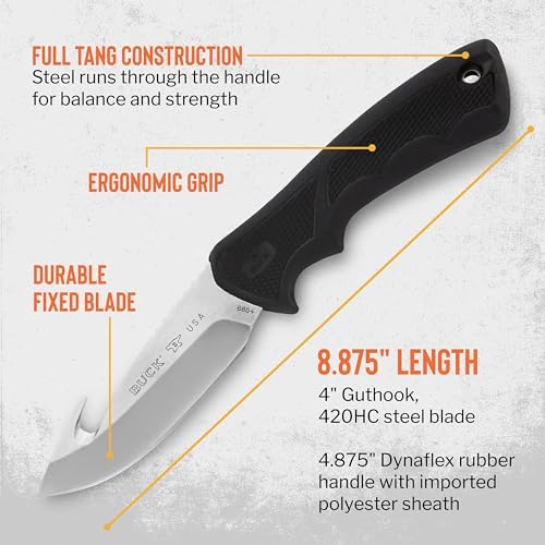 The Guthook hunting knife is a premium outdoor and survival tool crafted for hunters, campers, and bushcraft enthusiasts. Featuring a 4-inch 420HC stainless steel blade with a gut hook and a Dynaflex rubber handle, this full tang fixed-blade knife combines sharpness, durability, and ergonomic control for all outdoor tasks.