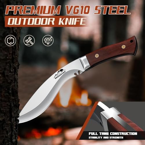 The Moontay Kukri Knife is a precision-crafted, full-tang outdoor knife designed for hunting, camping, bushcraft, and survival tasks. Built with a high-performance VG10 steel blade and ergonomic wooden handle, it combines durability, balance, and comfort for both rugged outdoor use and display-worthy craftsmanship.