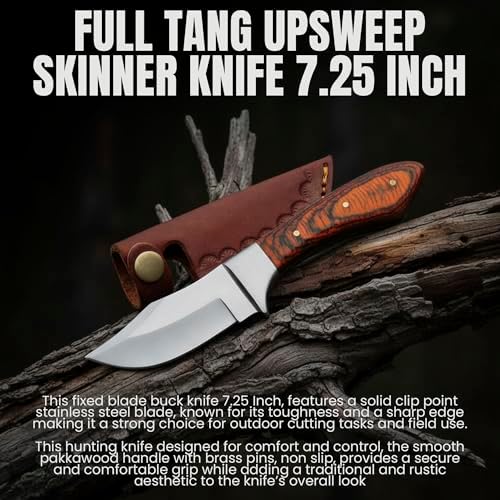The Full Tang Upsweep Skinner Knife is a premium outdoor tool designed for hunters, campers, and knife enthusiasts. Featuring a 7.25-inch solid stainless steel blade with clip point design and a pakkawood handle, this knife offers precision, durability, and comfort for all cutting tasks in rugged environments.