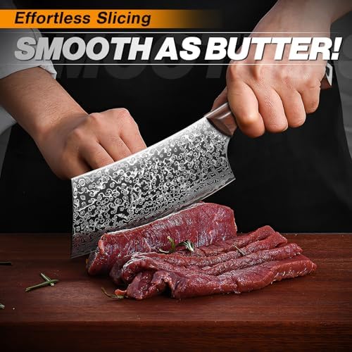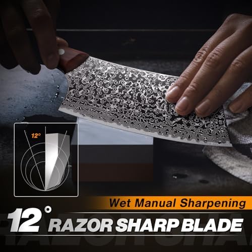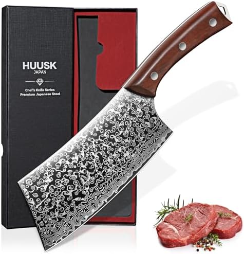 The Huusk 6.4 Inch Japanese Meat Cleaver Knife is a premium hand-forged meat cleaver designed for chefs and cooking enthusiasts. Crafted from 1095 high-carbon steel with an exquisite Damascus pattern, it delivers exceptional sharpness, precision, and durability for chopping, slicing, and dicing meat, vegetables, and fruits.