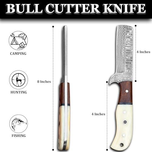 Experience the pinnacle of craftsmanship with this handmade Damascus bull cutter knife. Forged by skilled artisans using high-quality carbon steel, this 8” full-tang cowboy knife delivers razor-sharp precision, superior edge retention, and corrosion resistance. Perfectly suited for hunting, skinning, camping, bushcrafting, and everyday outdoor use, it’s both a tool and a work of art.