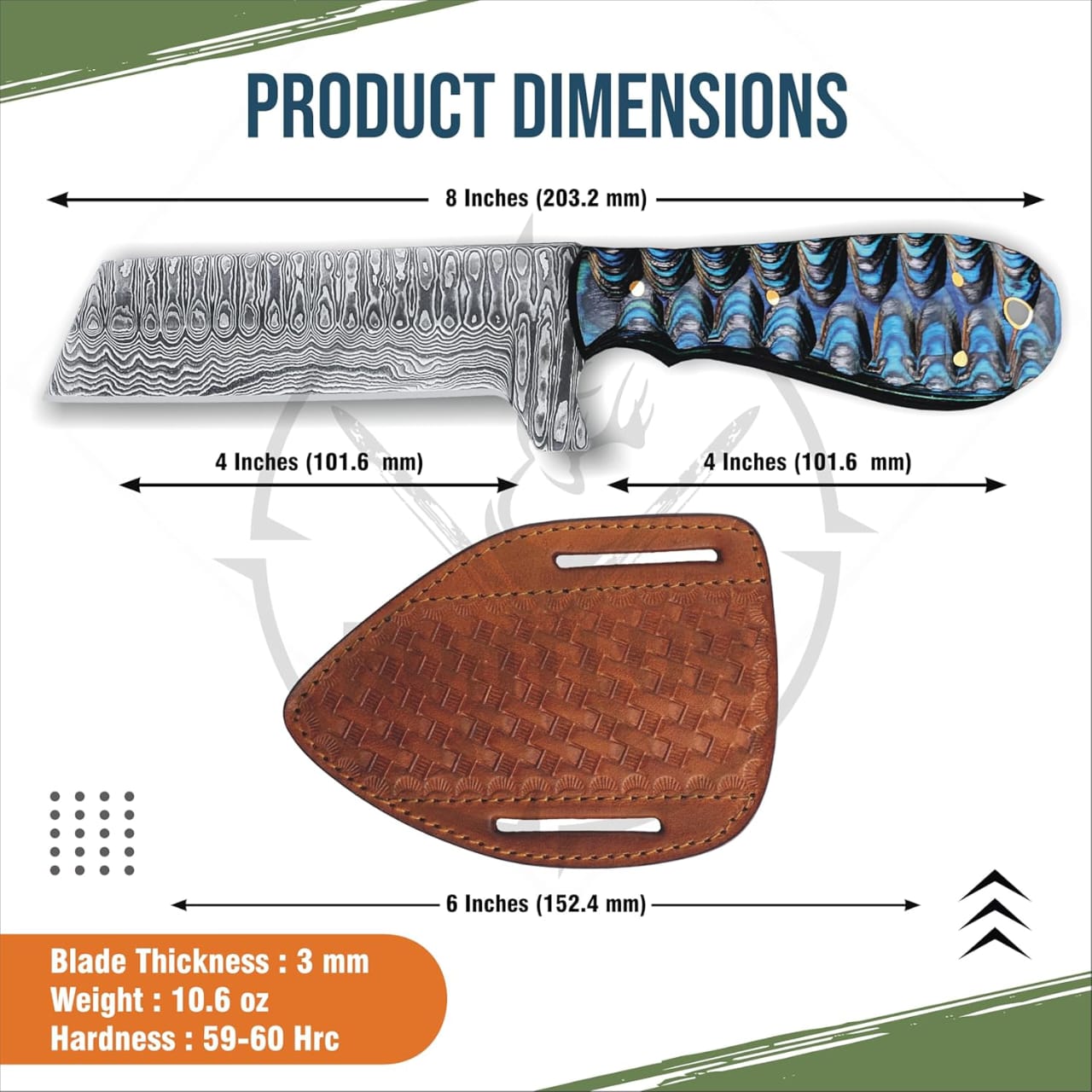 8" Damascus Steel with Leather Sheath: Premium 8" knife with 4" blade and 4" handle. Comes with a leather sheath featuring a snap fastener and elastic belt strap for secure carry.