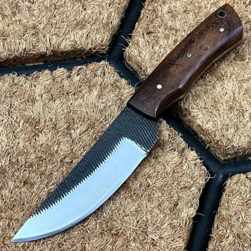 Experience precision craftsmanship with this handmade bull cutter knife. Expertly forged from rasp steel, this knife offers exceptional sharpness, durability, and reliability. Its ergonomic walnut wood handle ensures a secure and comfortable grip, making it perfect for hunting, camping, and everyday outdoor tasks.