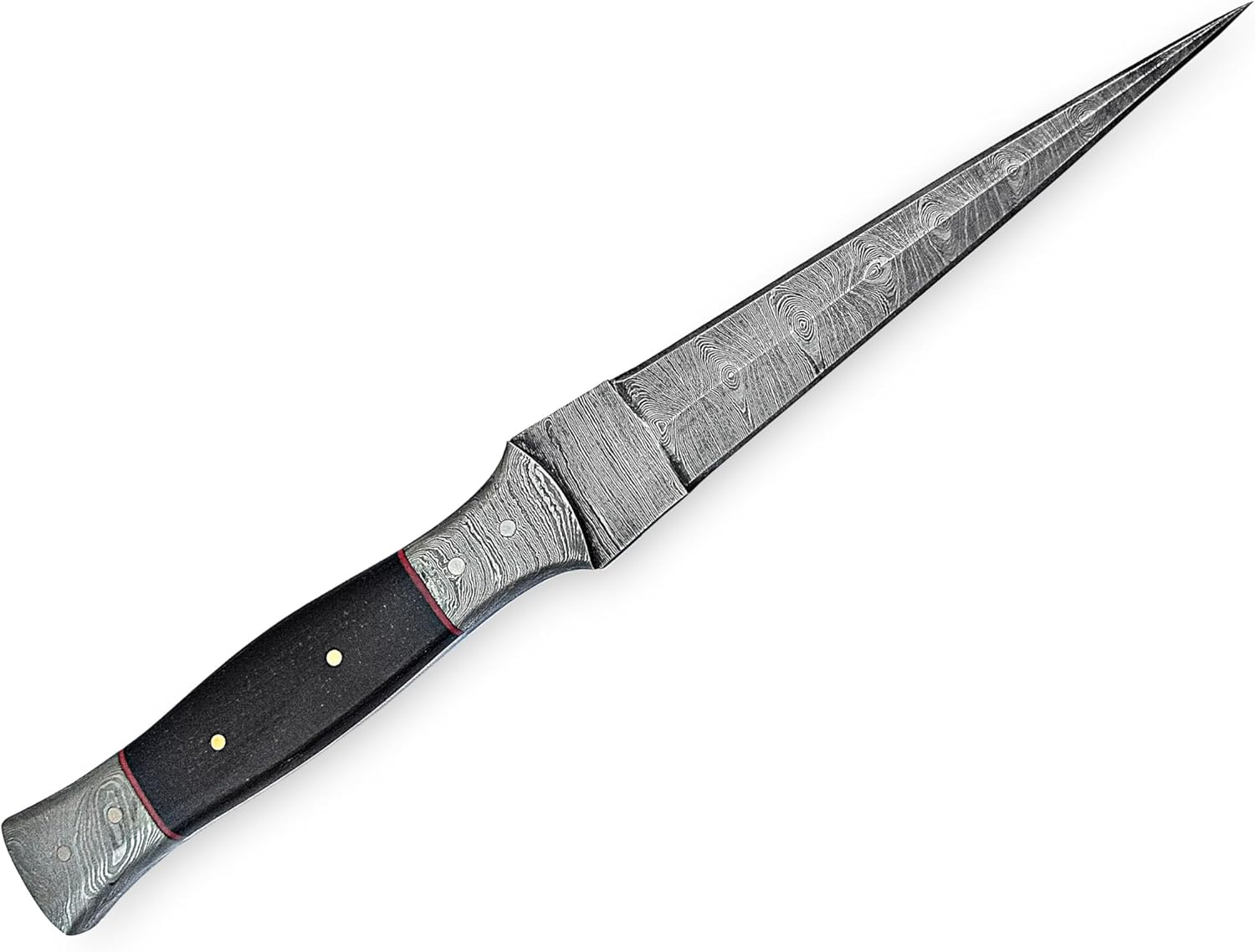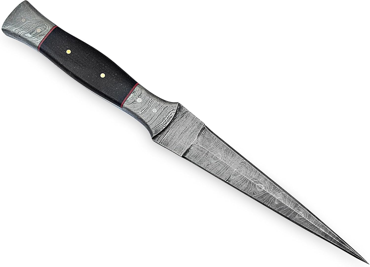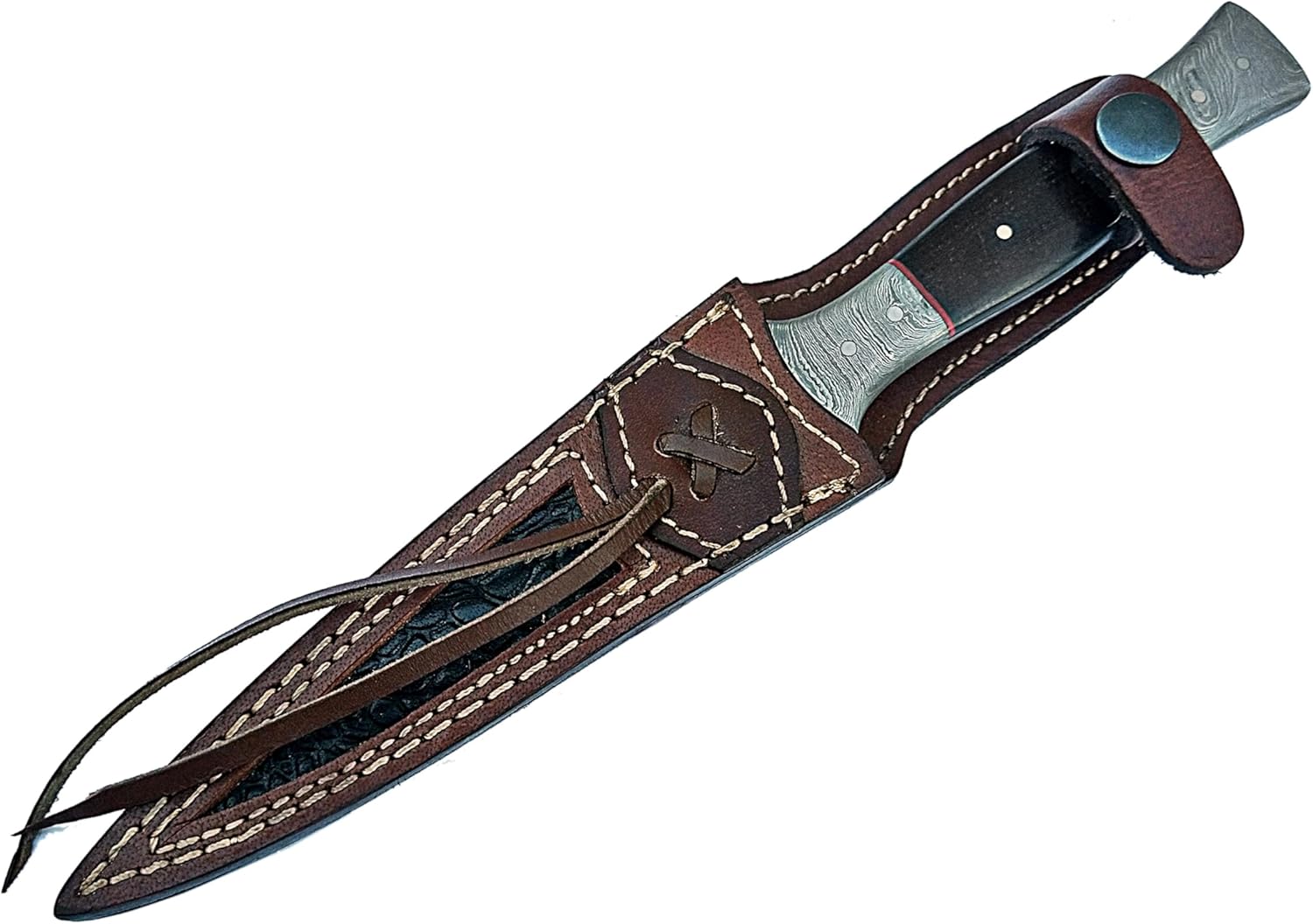 The Handmade Damascus Steel Hunting Knife is crafted for outdoor enthusiasts who demand precision, durability, and style. Featuring a sharp Damascus steel blade, ergonomic Macarta handle with Damascus steel bolsters, and a premium handmade leather sheath, this knife is perfect for hunting, camping, survival, and bushcraft activities.