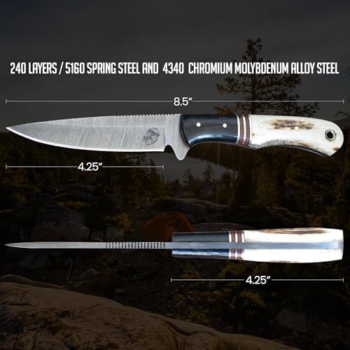 This hunting knife Damascus steel edition is crafted for serious outdoor enthusiasts and professional hunters. Featuring 240 layers of hammer-forged carbon steel, it delivers unmatched edge retention, strength, and a unique, eye-catching pattern. Full tang construction ensures durability for skinning, camping, bushcraft, and general field tasks.