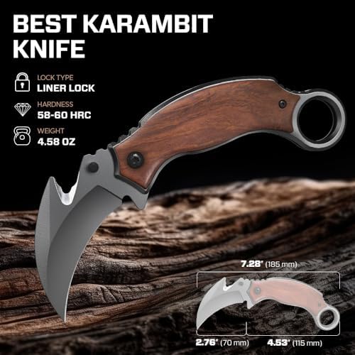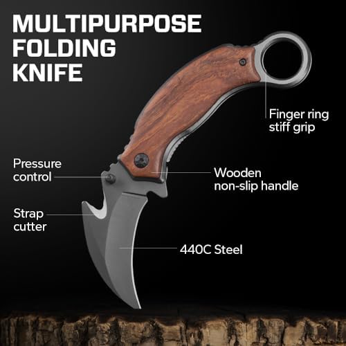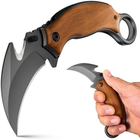 The Karambit Folding Knife combines elegance, precision, and practicality in one compact EDC tool. Crafted with durable 440C stainless steel and a natural wood handle, this knife is designed for hunters, campers, survivalists, and tactical enthusiasts who need a reliable, sharp, and stylish blade for everyday carry.