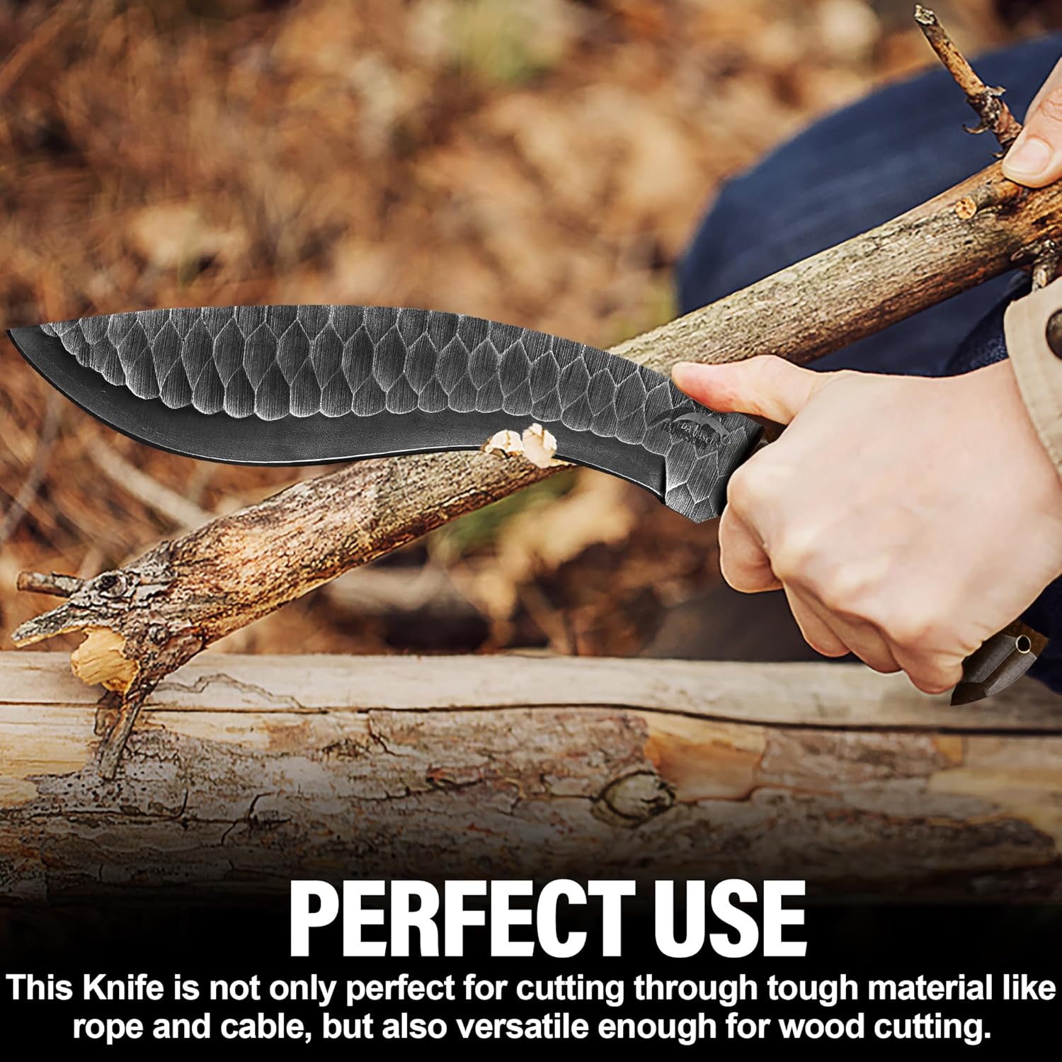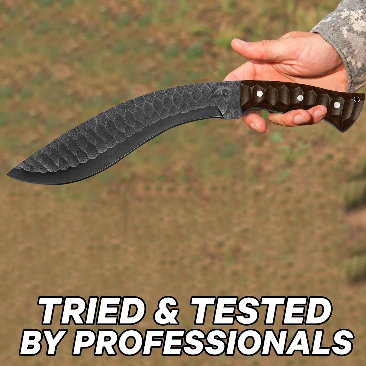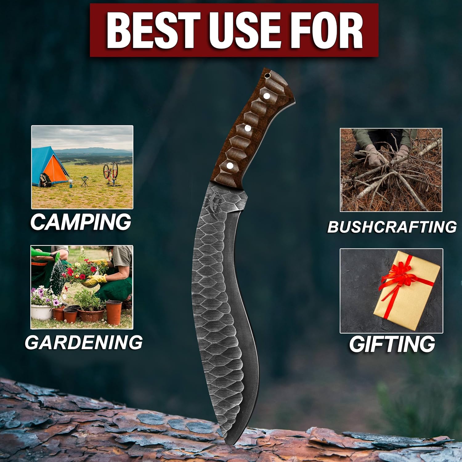 Experience exceptional craftsmanship with this handmade hunting knife built for performance, durability, and outdoor versatility. Designed with a razor-sharp carbon steel blade, a premium Micarta handle, and a protective leather sheath, this kukri-style tool excels in chopping, bushcraft, camping, and professional field tasks.