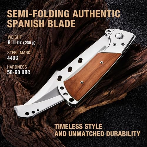 The Long Blade Folding Knife is a versatile folding knife designed for outdoor enthusiasts, hunters, campers, and survivalists. Featuring a semi-folding design with a long clip-point 440 stainless steel blade, this knife offers razor-sharp precision, corrosion resistance, and ergonomic wood and metal handle for comfort and control in every task.
