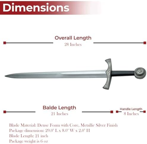 Attribute Specification Number of Swords 2 Length 37 inches each Material Dense foam with plastic inner core Finish Metallic silver Weight Lightweight for safe handling Age Recommendation 10 years and older Ideal Use Cosplay, Halloween, Display, Roleplay
