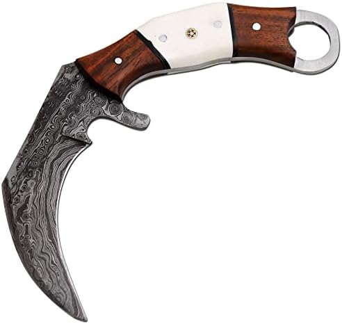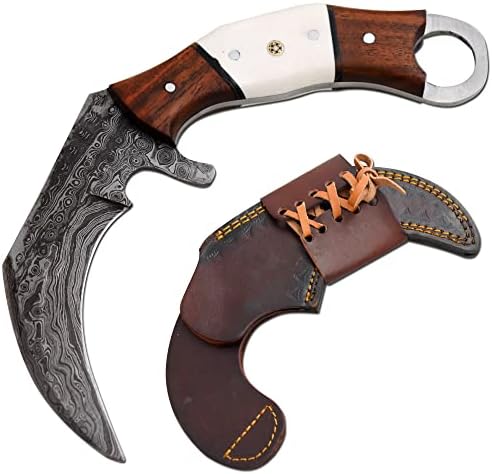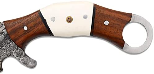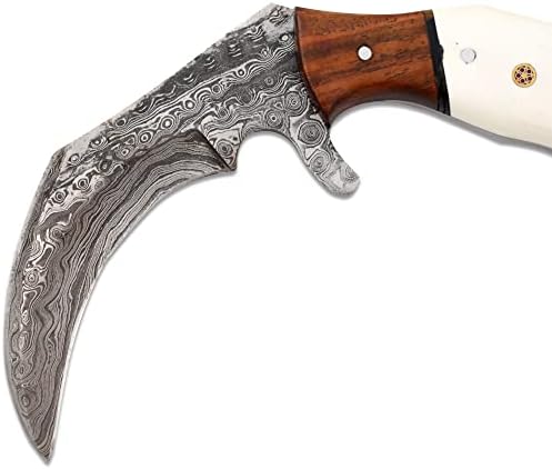 Home Hunting Knives Karambit Knives Old Ram Full Tang Handmade Fixed Blade Damascus Hunting knife Collection 8.5 inches Overall Length of Knife 7 Inches Real Damascus Sharp Blade 6 Inches Bone & Frost Wood Handle Comes With Premium Stitched Leather Sheath