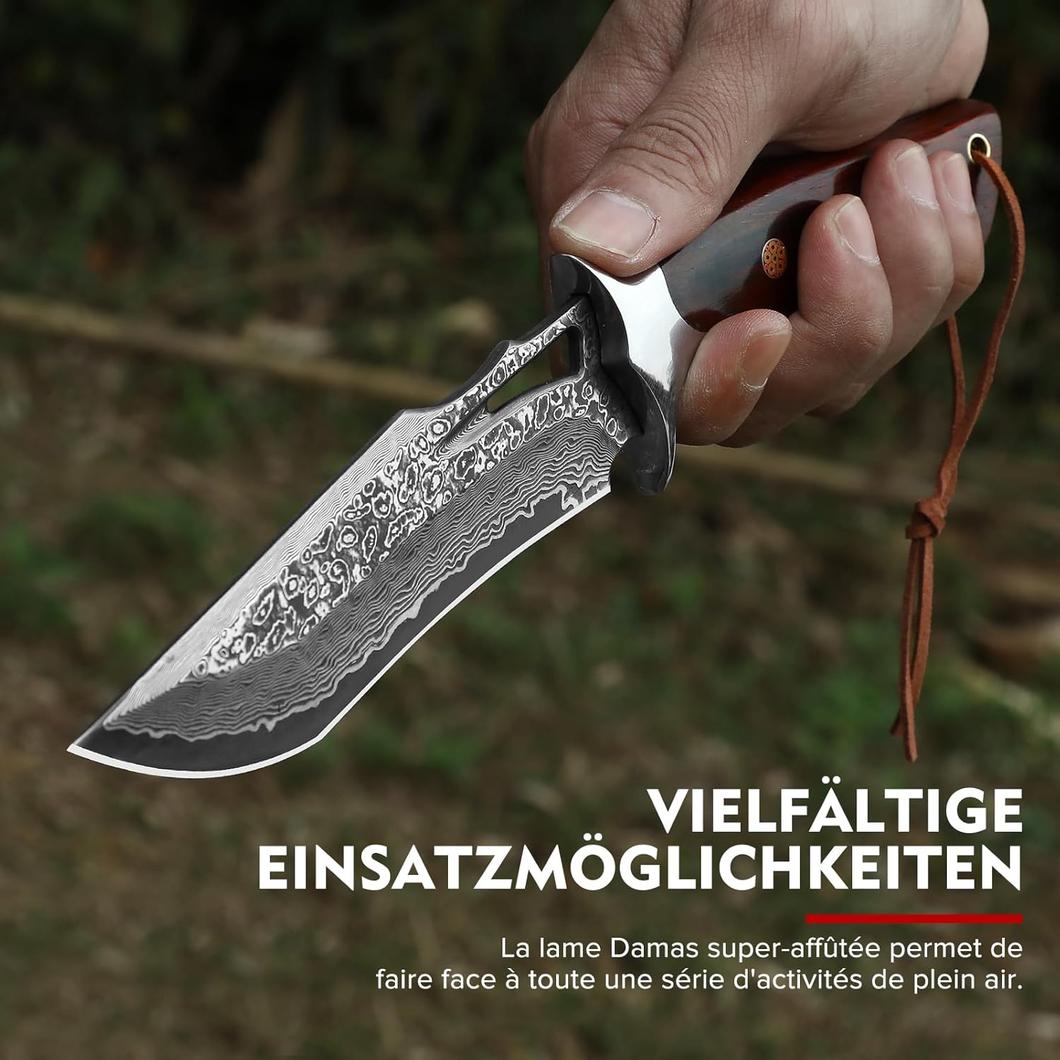 The Omesio Damascus Hunting Knife is a hand-forged masterpiece designed for durability, precision, and versatility. Crafted from 67 layers of premium Damascus steel, this fixed-blade knife combines exceptional sharpness, ergonomic handling, and a stylish wooden handle, making it ideal for outdoor enthusiasts, survivalists, and collectors alike.