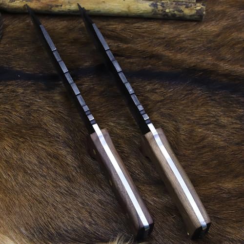 To keep your hunting knife in optimal condition, make sure to clean the blade regularly after each use to remove dirt, sap, and moisture. Apply oil to prevent rust and maintain sharpness. When storing the knife, always keep it in its leather sheath to protect the blade and avoid accidental damage. For the wood handle, clean it gently with a damp cloth and ensure it remains dry to prevent swelling or cracking.