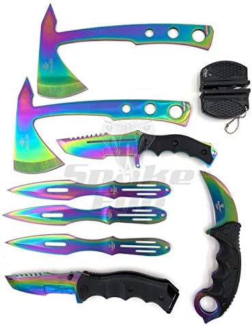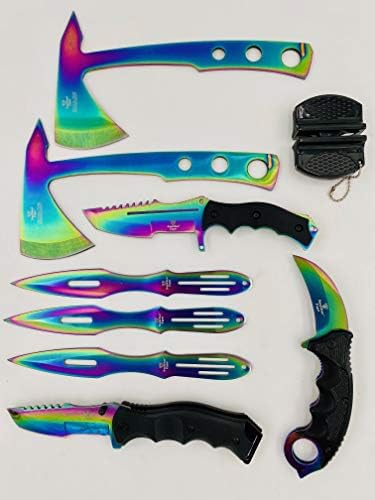 The Snake Eye 6-Piece Tactical Knife Set (Rainbow Edition) combines bold visual appeal with serious outdoor functionality. Designed for survival enthusiasts, campers, and collectors, this tactical knife set includes full tang blades, folding knives, throwing knives, and a tomahawk-style axe—all finished in an eye-catching rainbow coating.