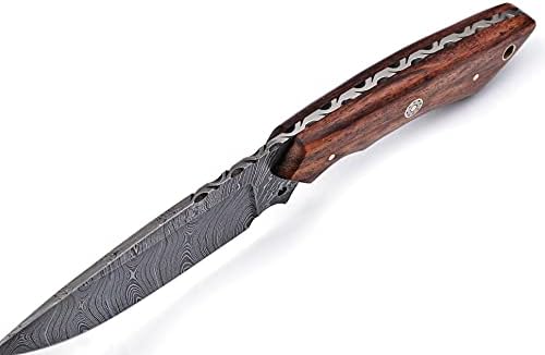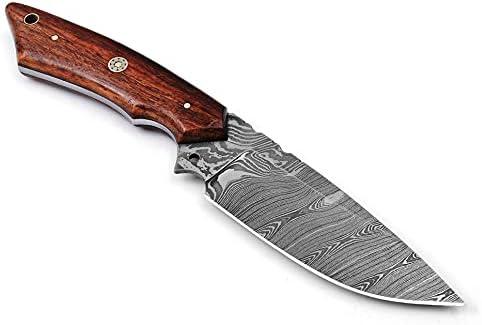 This Damascus steel hunting knife is expertly handcrafted for hunters and outdoor enthusiasts who demand precision, control, and durability. Featuring a razor-sharp patterned blade and a natural wood handle, it’s designed for efficient skinning, field dressing, and dependable outdoor performance.