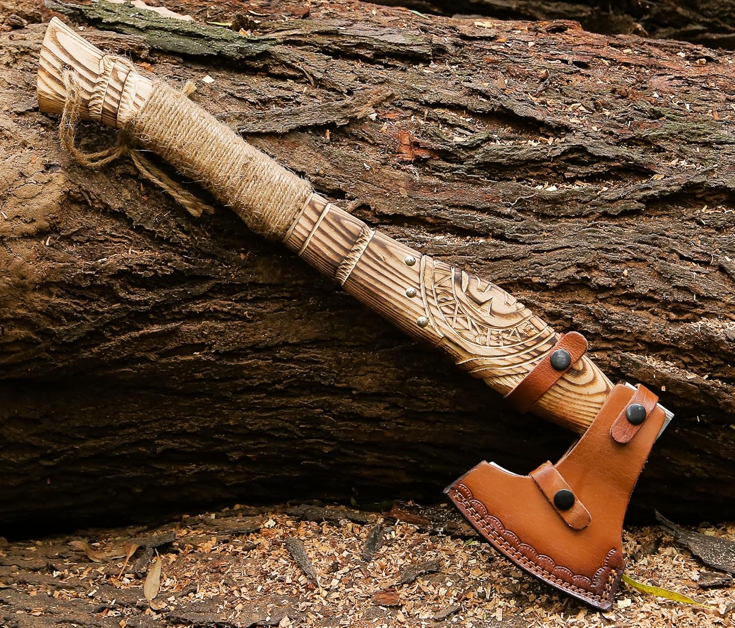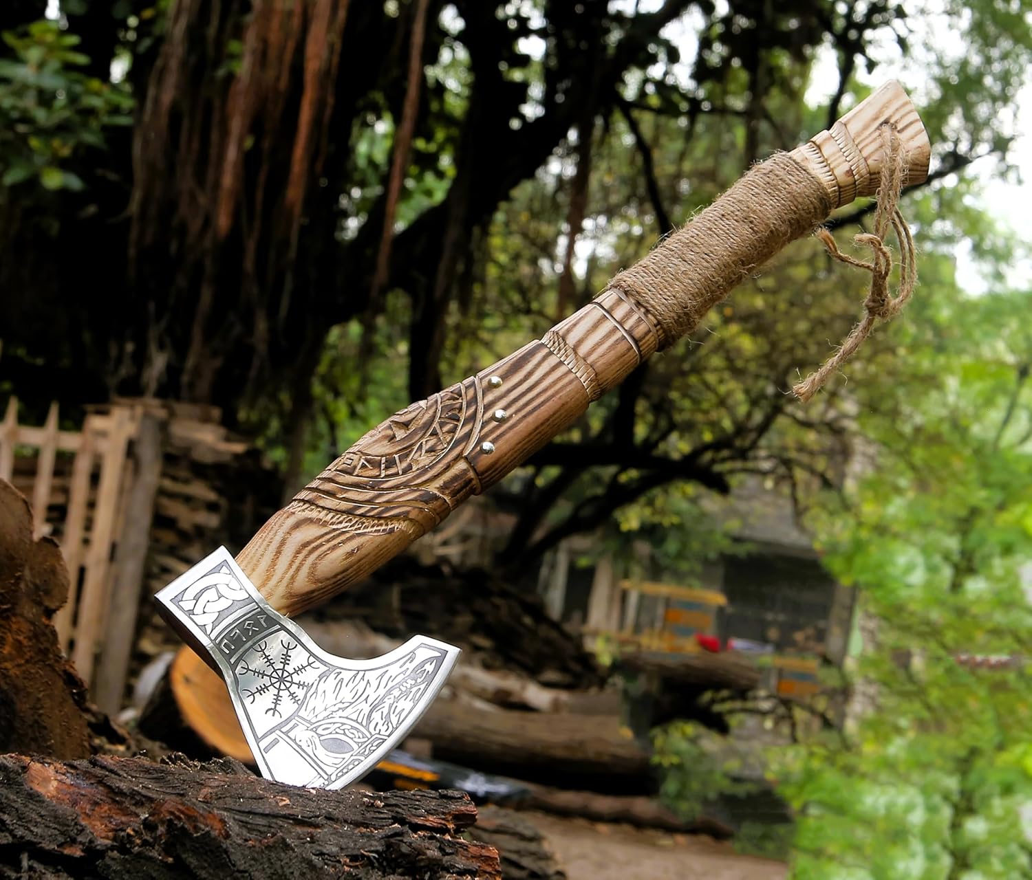 This axe delivers both beauty and practicality. Its durable carbon steel blade and balanced rosewood handle make it ideal for chopping, splitting, or outdoor survival tasks. At the same time, its Viking-inspired design adds historical charm to any space, making it perfect for display.