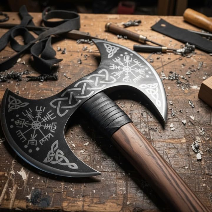 This Double Headed Viking Axe is a fully functional, battle-inspired tool crafted for performance, durability, and visual impact. Forged from high carbon steel and finished with precision engraving, etching, and carving, this 24-inch axe blends traditional Viking aesthetics with modern craftsmanship. Designed for real use as well as display, it is ideal for collectors, outdoor enthusiasts, and premium gift buyers.