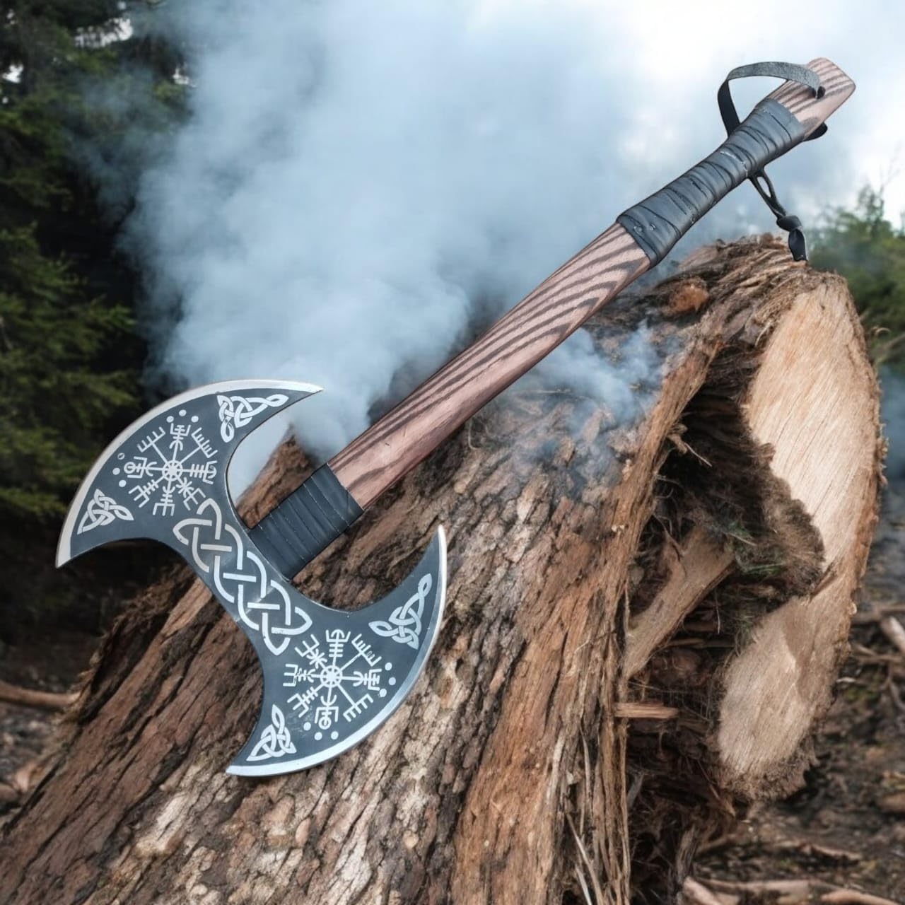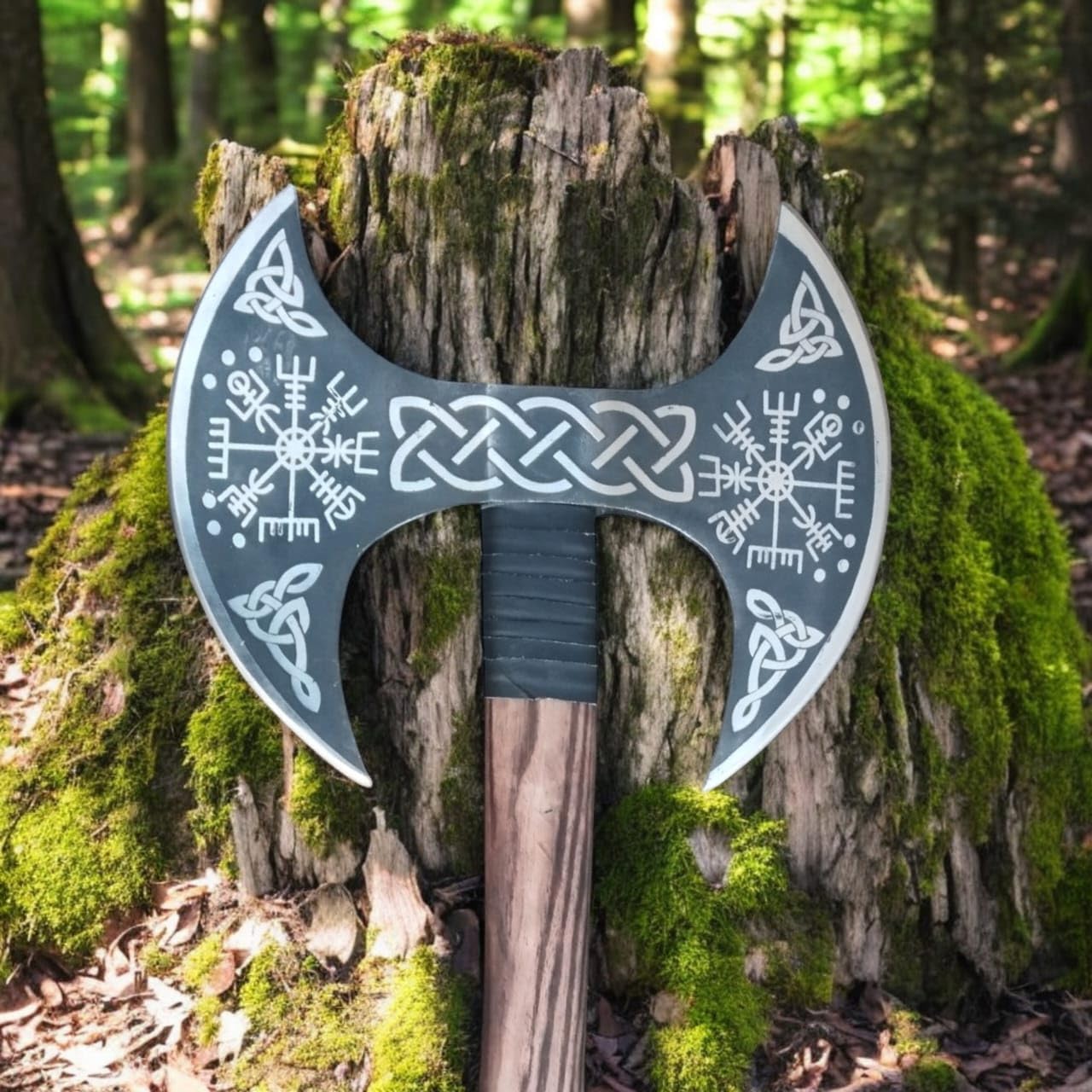 This Double Headed Viking Axe is a fully functional, battle-inspired tool crafted for performance, durability, and visual impact. Forged from high carbon steel and finished with precision engraving, etching, and carving, this 24-inch axe blends traditional Viking aesthetics with modern craftsmanship. Designed for real use as well as display, it is ideal for collectors, outdoor enthusiasts, and premium gift buyers.