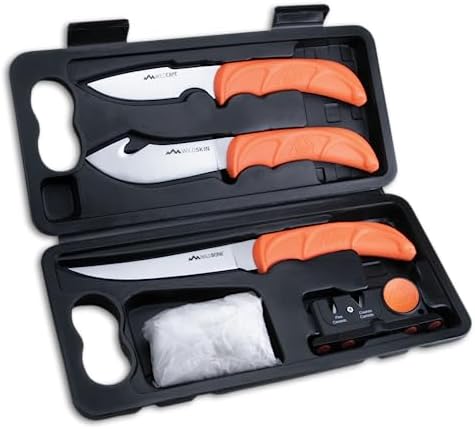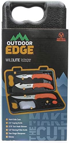 The WildLite Hunting Knife Set by Outdoor Edge is a premium 6-piece kit designed for hunters and outdoor enthusiasts. Engineered for field-to-freezer game processing, it includes essential tools like gutting and skinning knives, a caping knife, boning knife, game gloves, and a two-stage sharpener. Packaged in a lightweight, hard-side field case, this set ensures convenient portability for deer, elk, caribou, and poultry processing.