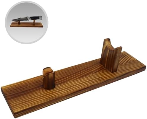 This knife display stand offers a premium way to showcase your fixed blade, pocket, or folding knives. Crafted from high-quality wood, it provides a stable, horizontal display while adding rustic charm to your cabin, kitchen, or office tabletop. Perfect for collectors and enthusiasts alike.